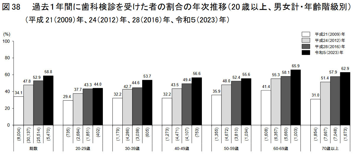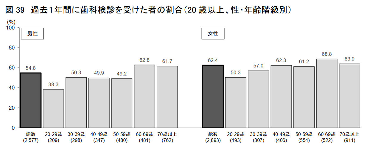 厚生労働省の2023年の調査によると、20歳以上の男女で過去1年間に歯科検診を受けた者の割合は約6割程度となっています。定期健診に限ったものではありませんが、30代でも54%が1年以内に歯の検診を受けているという結果です。半数以上と考えると結構多いような。