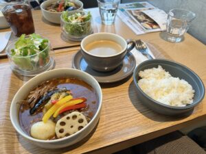 敷地内に隣接するクボタのレストランで、農機具のクボタだけに野菜にこだわったスープカレーをいただきました。